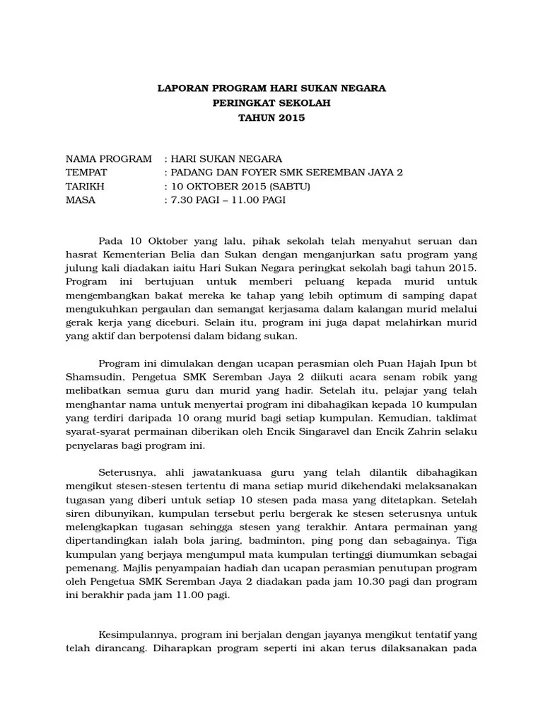 Laporan sukan tahunan sekolah sjk(c) hua lian 2 pada hari (pilih hari apa) yang lalu, (nama sekolah), telah mengadakan sukan tahunan sekolah. Laporan hari sukan negara peringkat sekolah 2016 tarikh : Sekolah.hari sukan bermula pada pukul 8:00 pagi.hari sukan diadakan di padang sekolah. Laporan hari sukan di maktab rendah sains mara balik pulau pada 2 hingga 4 mac. Contoh laporan berformat format karangan jenis laporan karangan jenis ini menghendaki anda melaporkan sesuatu peristiwa yang didengar.
